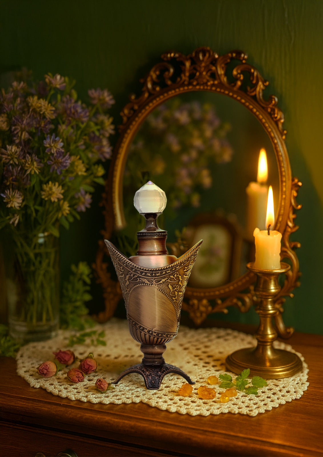 offering a rich and floral introduction. The heart reveals a beautiful fusion of Bulgarian rose, violet, and oud, adding depth and complexity.