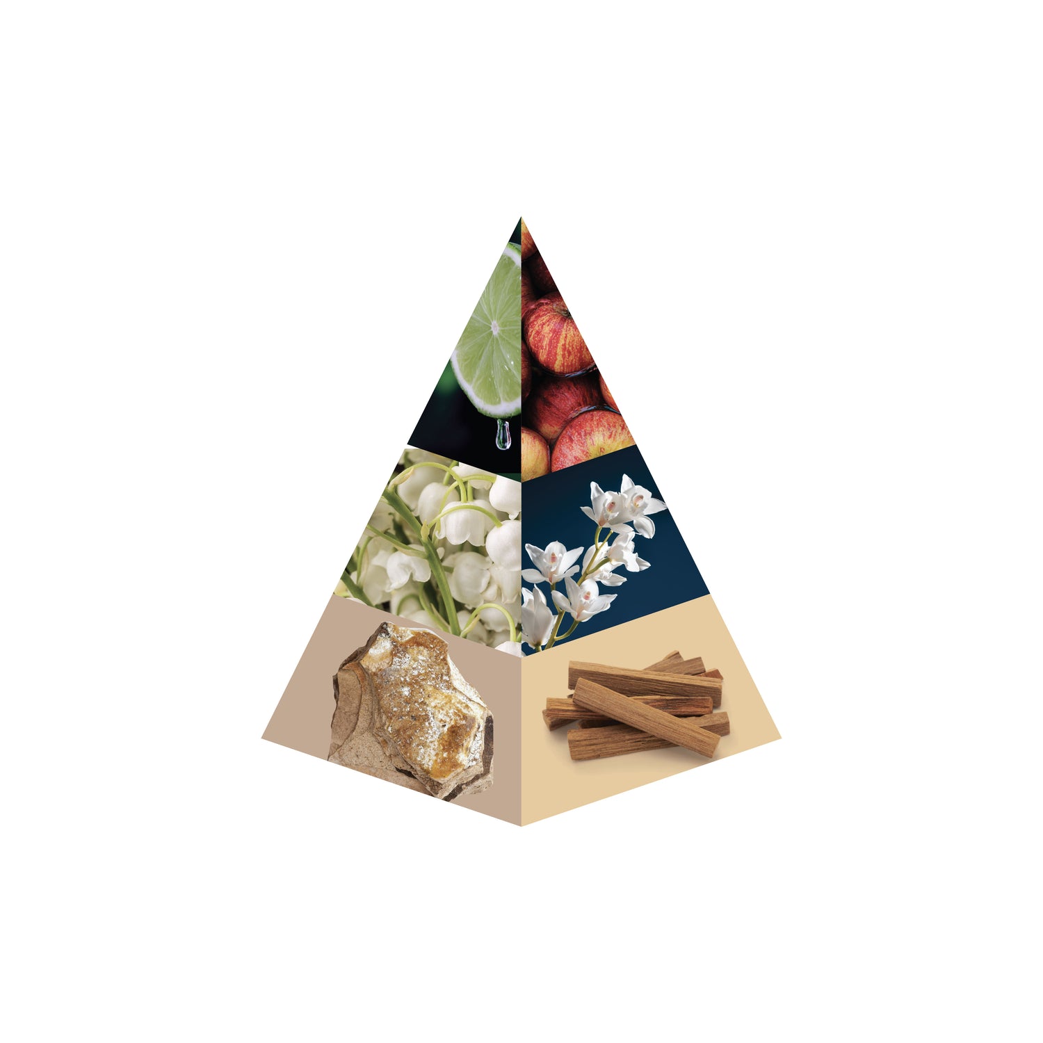 The heart reveals a delicate floral blend of green notes, jasmine, lily of the valley, and orchid, adding elegance and softness.